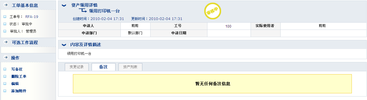 3. 单击<保存>按钮,即可添加新的资产领用申请。系统自动进入资产领用详情界面,状态为[审批中],如下图所示。
