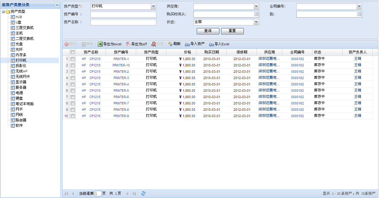1. 进入[资产列表]界面,设置查询条件,可以是资产类型、供应商、合同编号等。