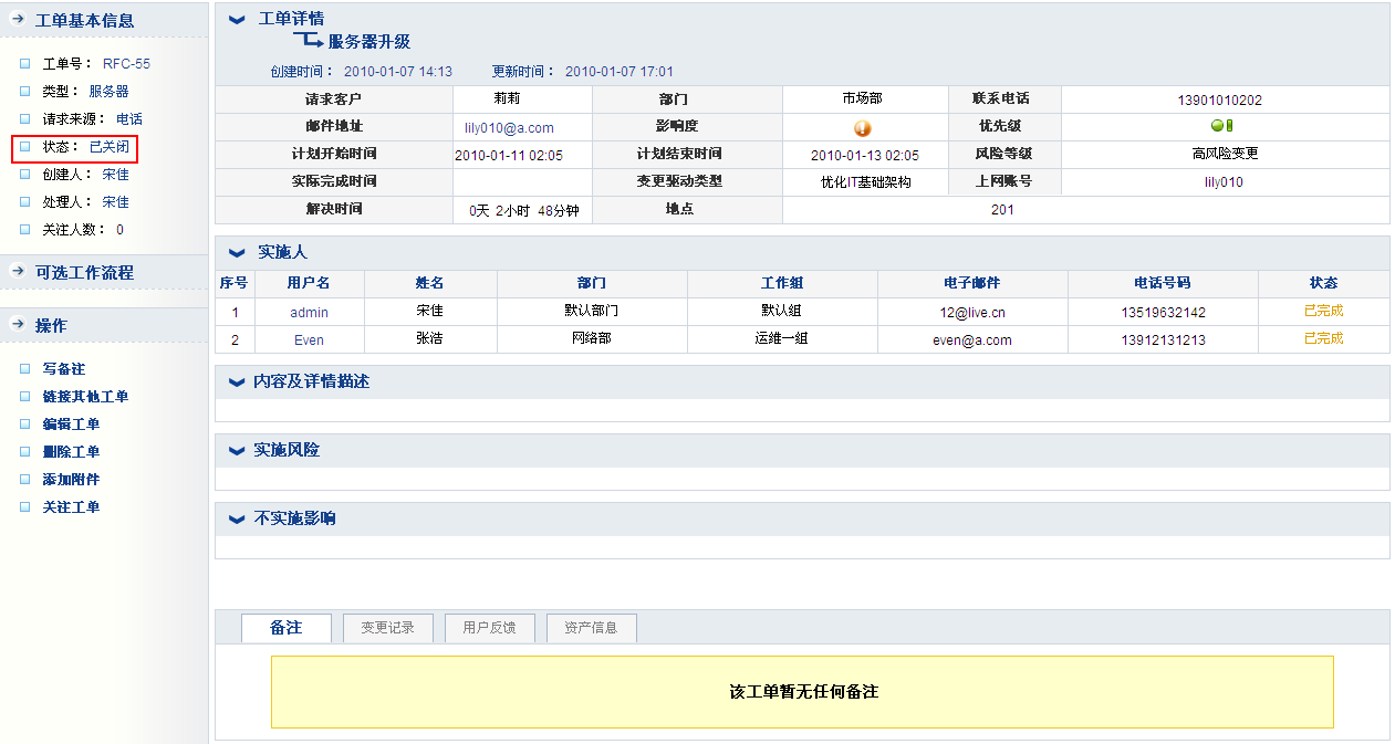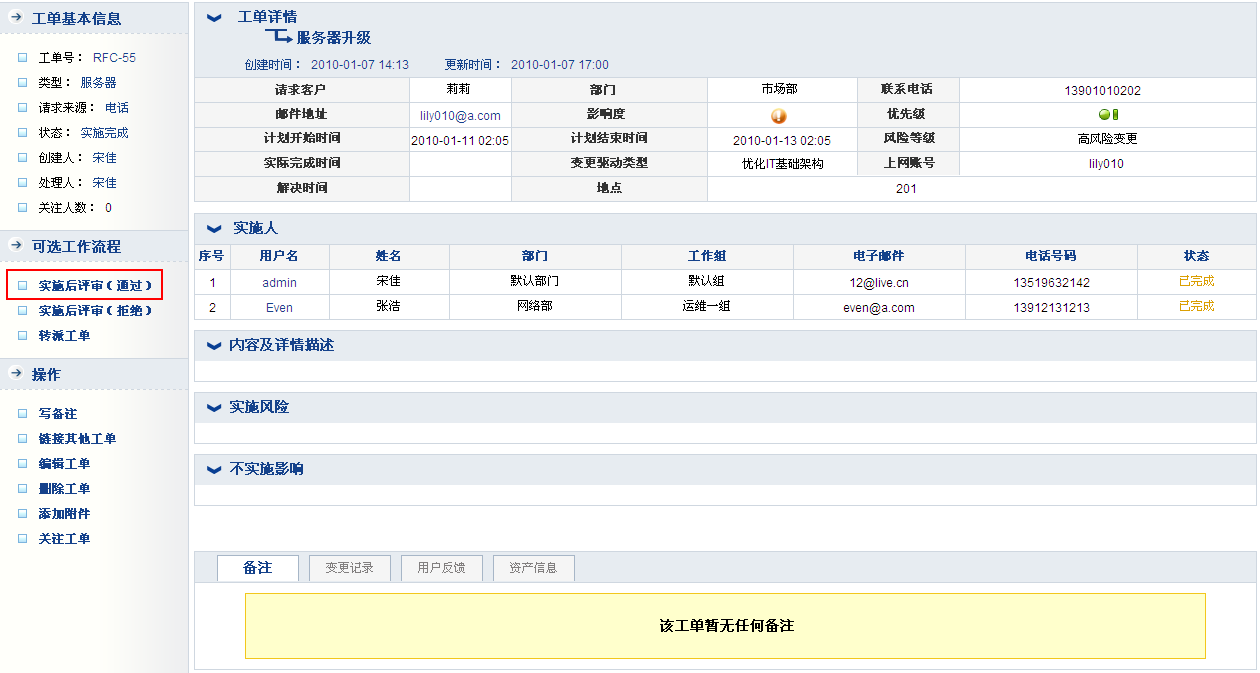 3. 选择某个状态为[实施完成]的工单,单击工单号上的超链接,进入工单详情界面。
