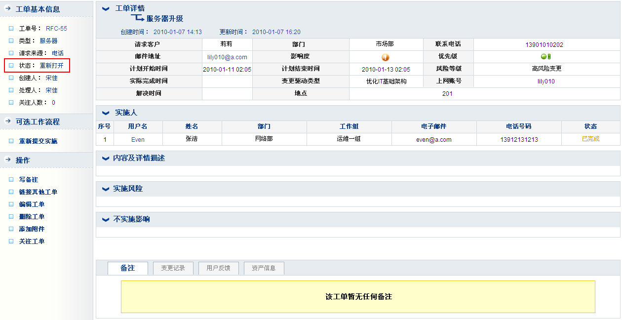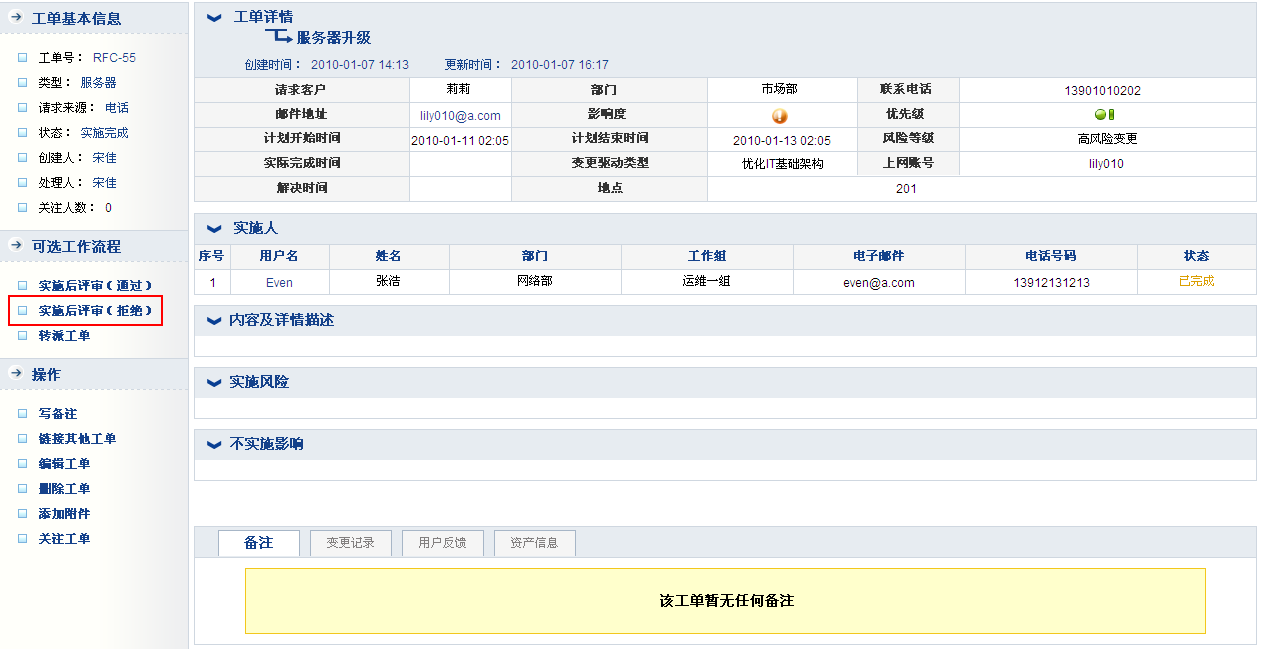 3. 选择某个状态为[实施完成]的工单,单击工单号上的超链接,进入工单详情界面。
