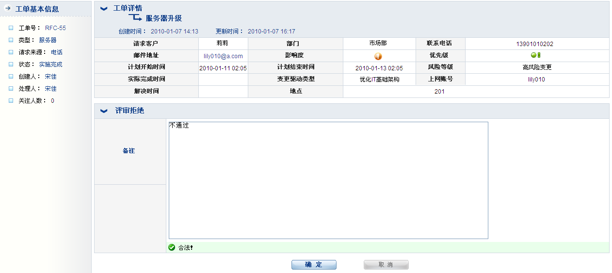 5. 输入备注信息,即可评审拒绝该工单,工单状态更新为[重新打开]。评审拒绝的工单可以重新提交实施。