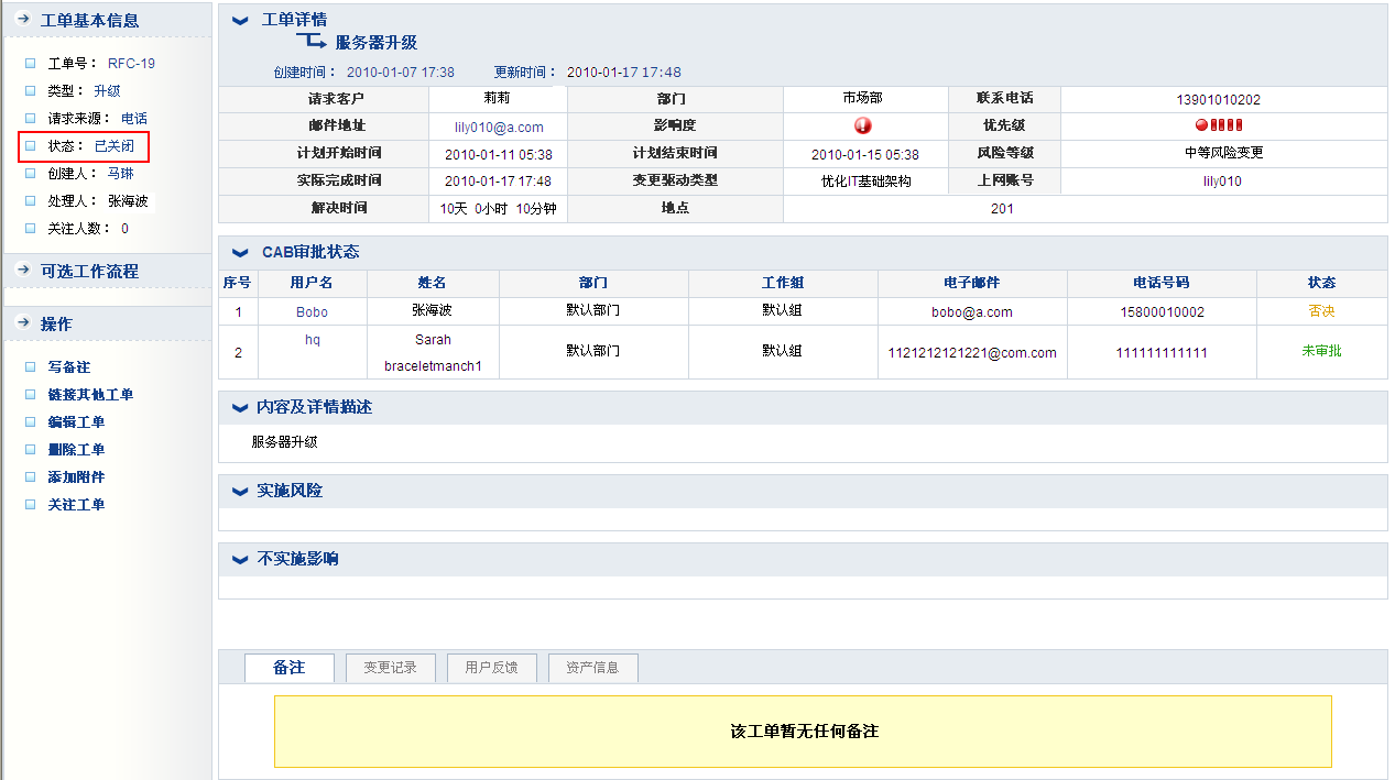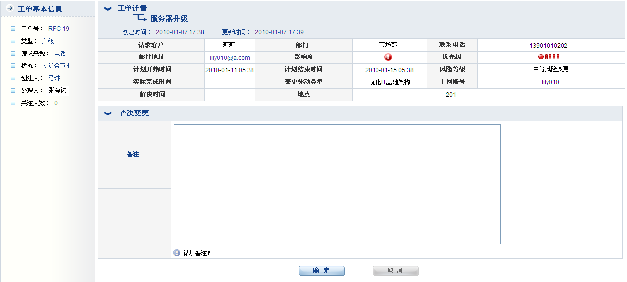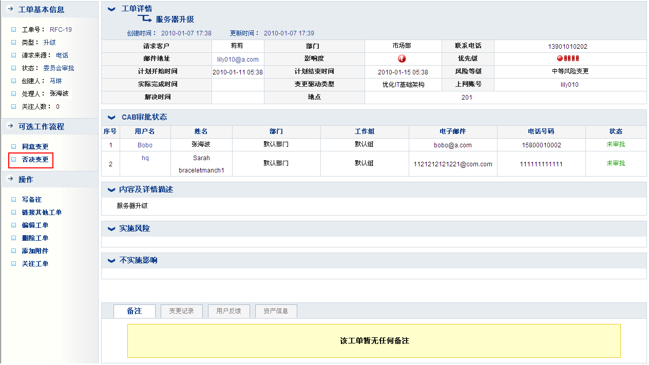 注意:提交至变更委员会审批的工单,只要其中一人否决,工单即被直接关闭。 |