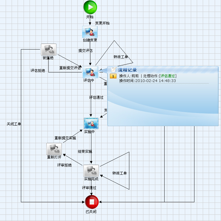 对于每一个流程实例,在它的生命周期中均会经过不同的状态直到最终被关闭,系统支持在工单流程实例的任何时候能够以图形化的方式展示该流程工单可能经过的所有状态,这样用户就能够以图形化的方式一目了然的知道流程各个状态下的变更记录信息及流程所处的当前状态。