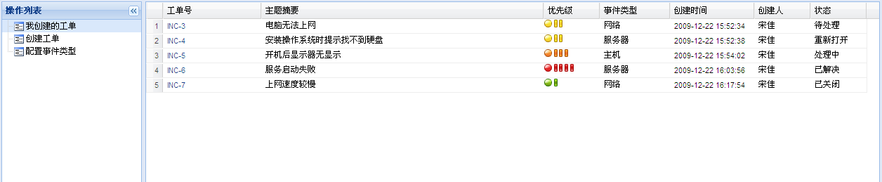 在主界面中单击菜单[运维管理]→[事件管理]→[我创建的工单],进入[我创建的工单]界面,如下图所示。