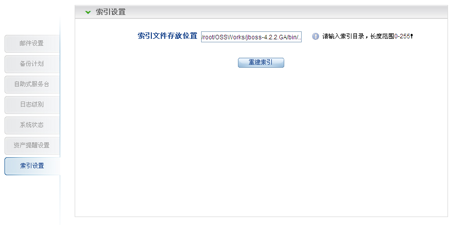 系统内嵌搜索引擎以支持任意关键字的全文检索,需要在磁盘上保存索引文件。索引文件存放的位置可以是系统所在操作系统的任意真实合法的文件夹,请注意填写合法的文件夹路径。当索引文件遭到破坏导致搜索功能不可用时,可以通过重建索引来恢复索引文件。
