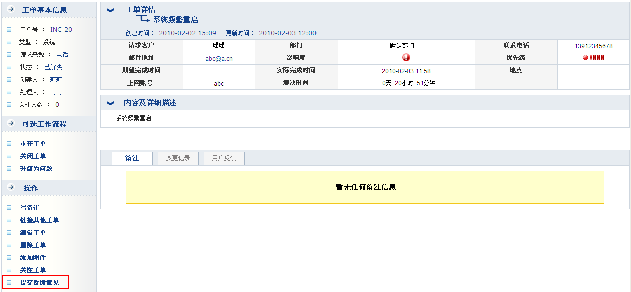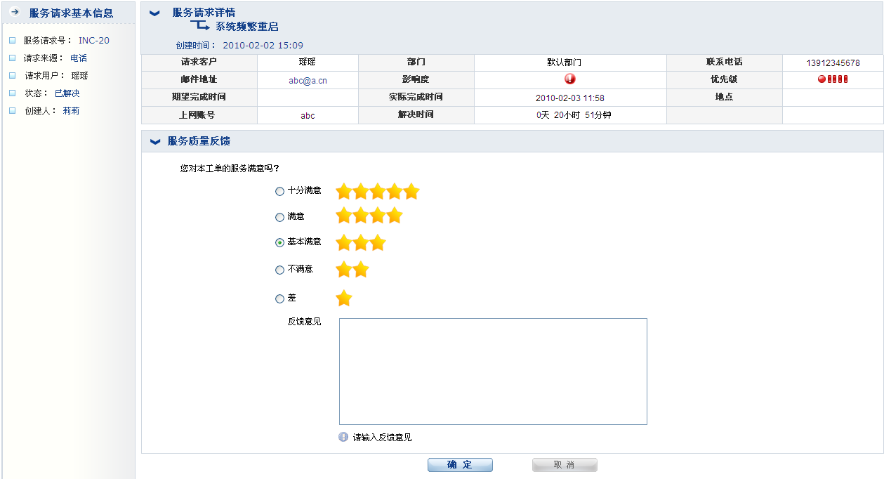 对于已经解决的工单,用户可以提交服务质量反馈意见。