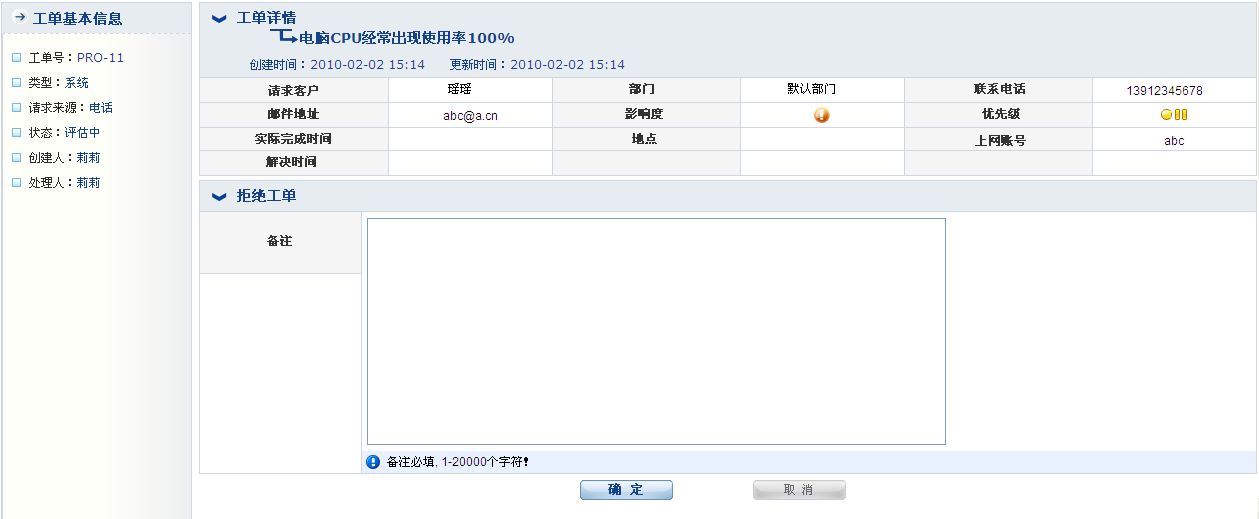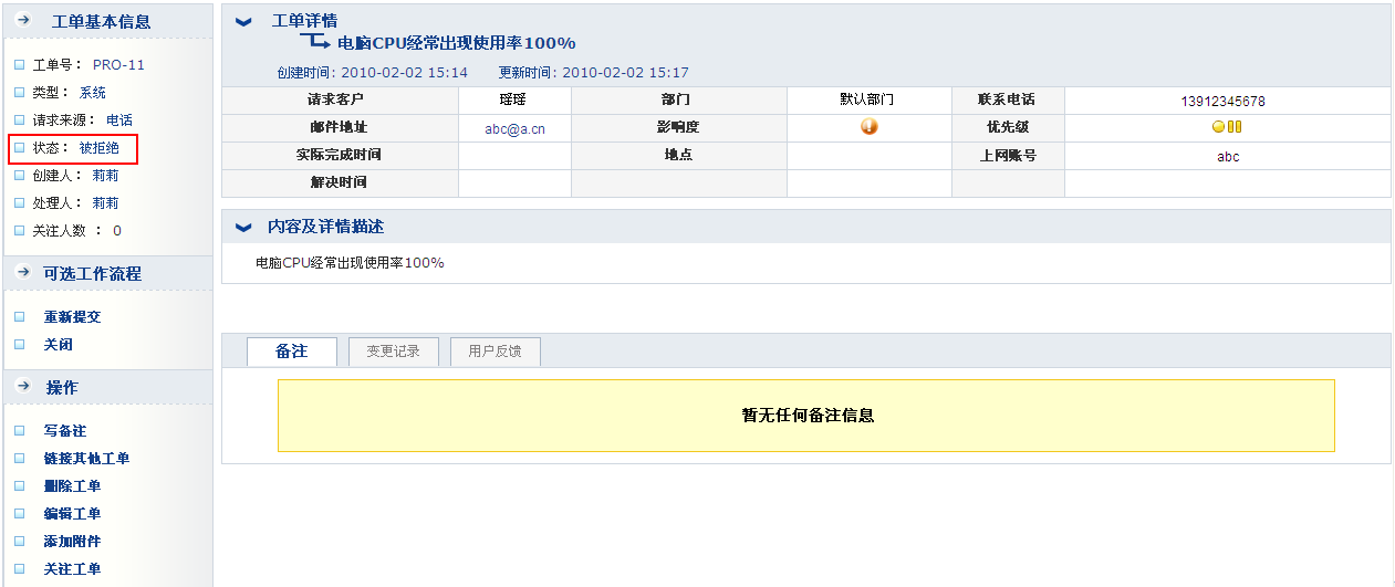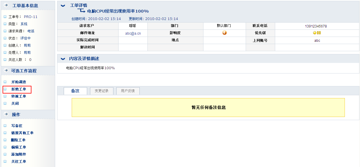 5. 输入备注信息(必填),即可拒绝调查该工单,工单状态更新为[被拒绝]。同时新增一条变更记录,备注信息显示在变更记录中。被拒绝的工单可以重新提交。