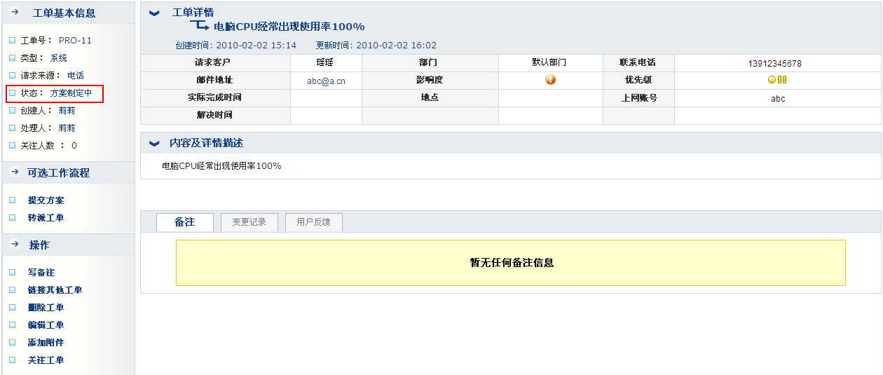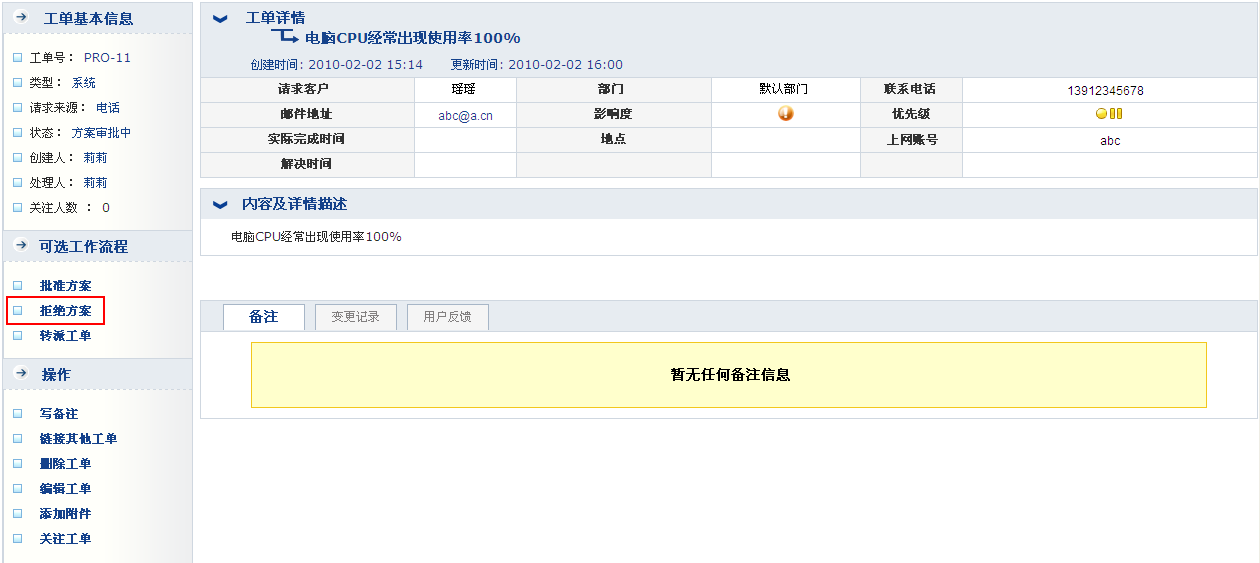 4. 单击可选工作流程<拒绝方案>,输入备注信息,即可拒绝方案,工单状态再次更新为[方案制定中],可以重新提交方案。