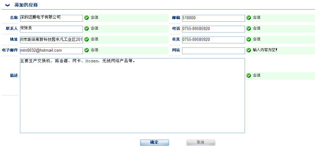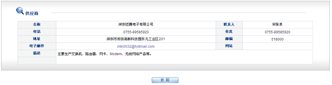 单击供应商名称上的超链接,进入[供应商详情]界面,可以查看供应商的详细信息,如下图所示。