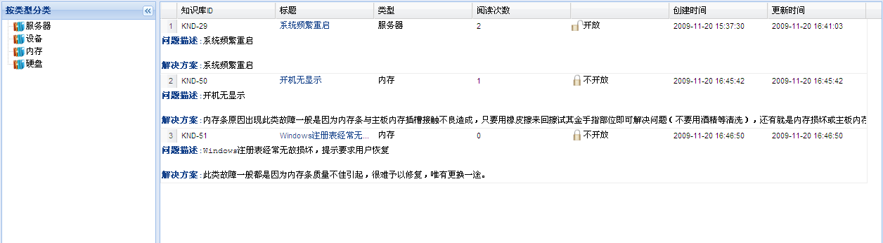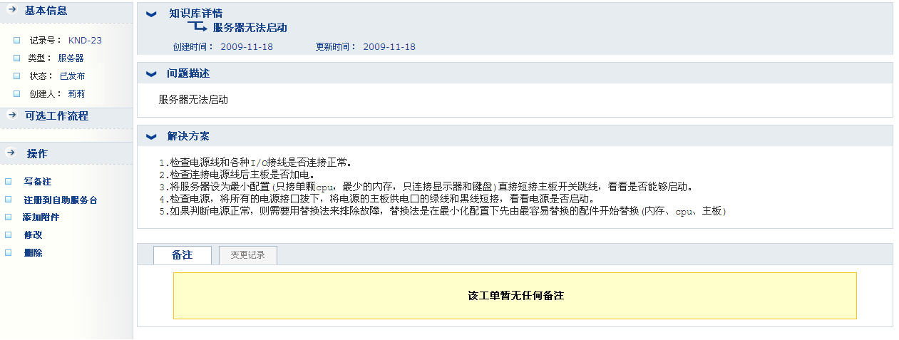 单击知识库编号或标题上的超链接,进入[知识库详情]界面,可以查看知识库的详细信息,如下图所示。