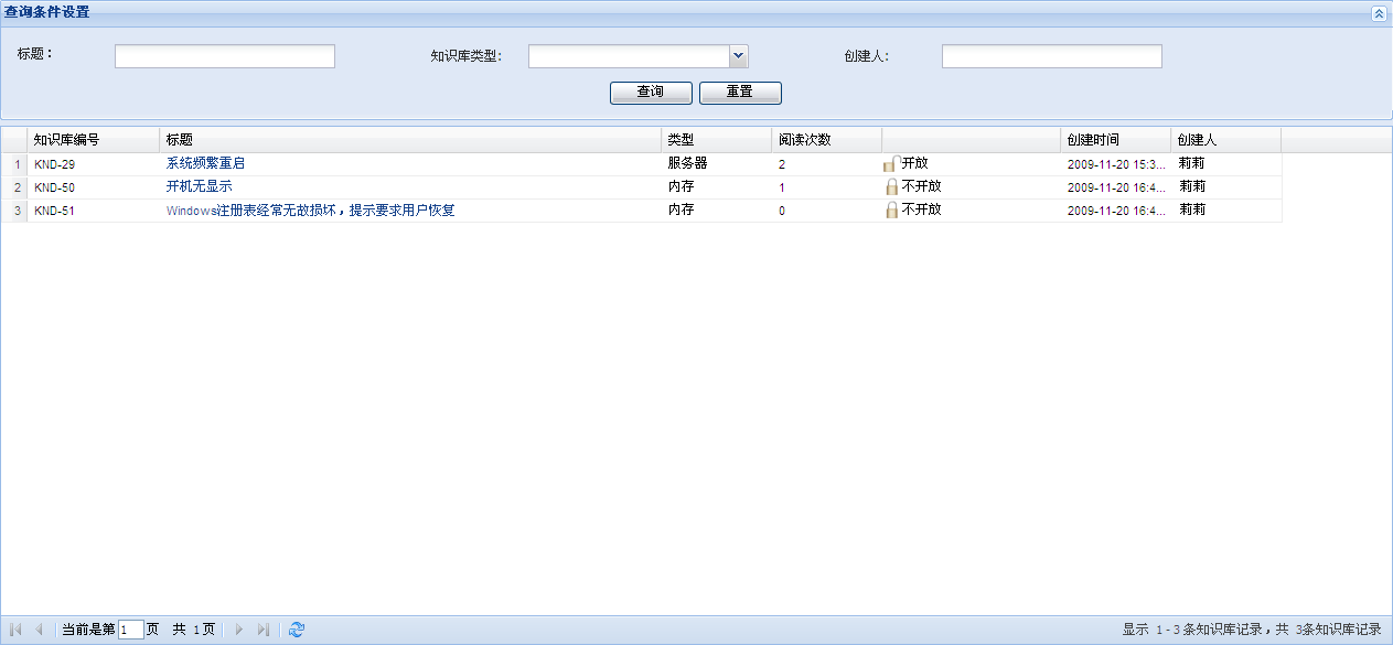 2. 设置查询条件,例如标题、知识库类型、创建人。其中,标题支持模糊查询。